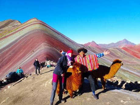 Caminando y descansando, ese fue mi ritmo de caminata. Creo que después de dos horas llegue a una parte muy empinada, cuando alce mi vista hacia un mirador, vi mucha gente tomando fotos y celebrando por su triunfo, entendí que la montaña a lado mío era la famosa “Montaña Arcoíris” supe que debía hacer el último esfuerzo aunque me sentía desfallecer, por ratos pensaba que debía haber tomado otra opción tal vez una visita a la ciudad o un delicioso almuerzo con una cerveza fría pero ya no podía dar marcha atrás ya estaba allí así que a seguir adelante. 10 min más tarde estaba casi por completar mi aventura, aunque me pareció una eternidad. Llegue al mirador y tan pronto di la vuelta vi la maravilla que nunca espere ver. Ninguna foto antes vista hace justicia a la genialidad de la naturaleza geológica existente en la montaña, la combinación de colores la continuidad de los mismos. Indescriptible. En un afán por tomar la mayor cantidad de fotos posibles del entorno me di con la sorpresa que hacia el lado opuesto se encontraba uno de los picos nevados más altos de Cusco y del Perú, el imponente “Ausangate”. Todo el esfuerzo valió la pena, sentí que había conquistado una parte del planeta. Más tarde cuando regresaba al Cusco algo adolorido por el esfuerzo físico, no dejaba de maravillarme por todo lo que había visto, lo había logrado había conquistado los 5020 metros de altitud sobre el nivel del mar había llegado a la “Montaña Arcoíris”.